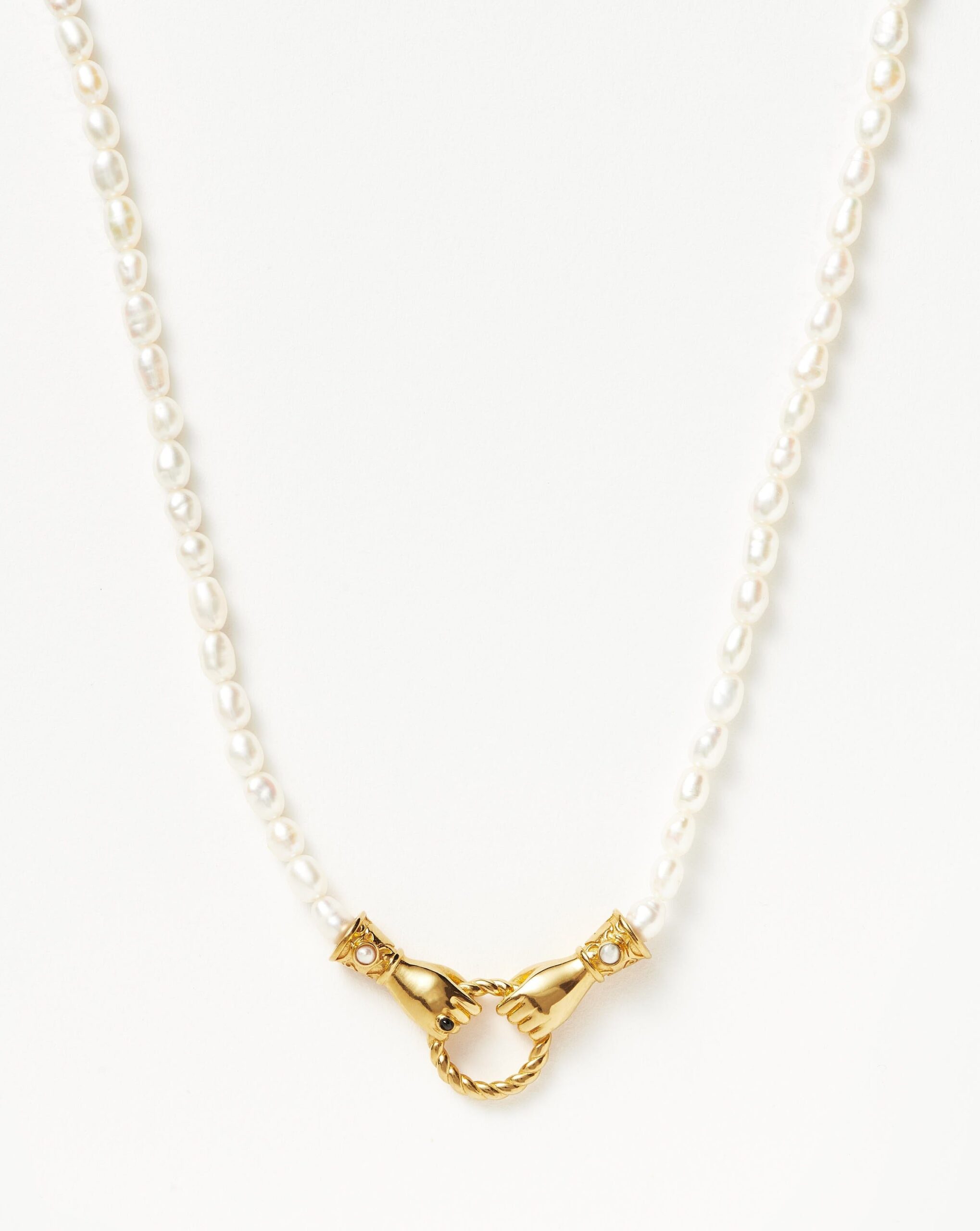 An Icon made longer. Two Georgian-inspired hands come together in this pendant. each holding a twisted ring. Intricately detailed. each cuff has been illuminated with white pearl cabochons and features a ring with a black onyx gemstone. The seed pearl necklace is finished with the collection’s bespoke butterfly end charm. a symbol of duality.