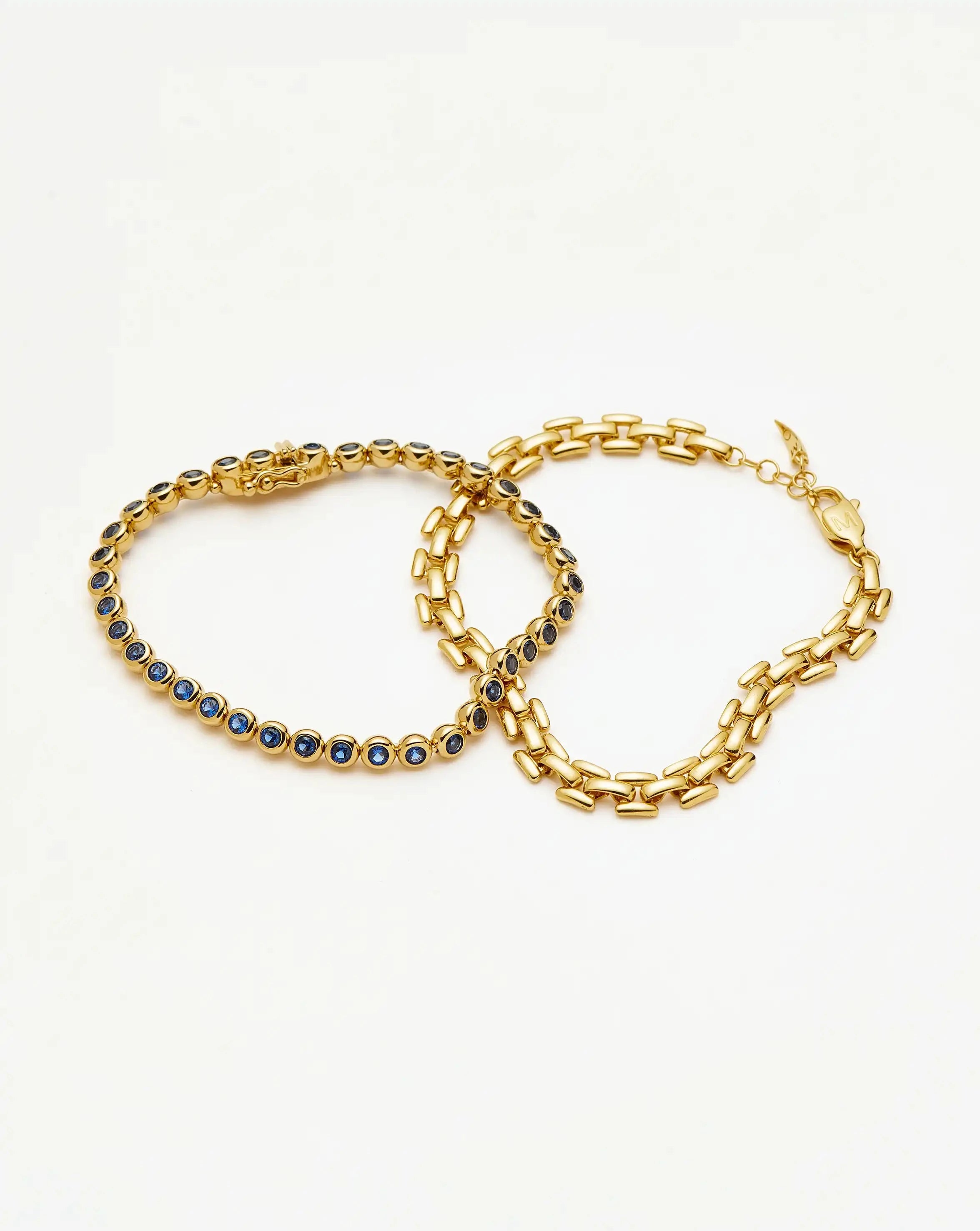 Two icons teamed together. Our Tennis Round Bracelet now in a new sapphire blue colourway. paired with the classic Timepiece Chain Bracelet. Wear together for double the impact.